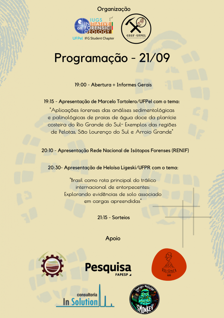 Entre os dias 21 e 22 de setembro de 2020 acontecerá o 1st Undergrad Geoforensic Research, evento virtual organizado e apoiado por diversas entidades do Departamento de Engenharia Geológica da Universidade Federal de Pelotas (UFPel), como o Capítulo Estudantil de Geociências Forenses da UFPel, o Grupo de Estudos em Geologia Forense (GEGF) e o Diretório Acadêmico de Engenharia Geológica (DAFPO). O evento contará com apresentações de pesquisas acadêmicas desenvolvidas por estudantes de Graduação, no âmbito das Geociências Forenses, as quais serão comentadas por banca especializada. A programação pode ser conferida abaixo: